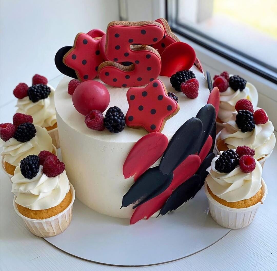 Красно-черные акценты поздравительного тортика отлично подходят для празднования дня рождения малышки в стиле Леди Баг